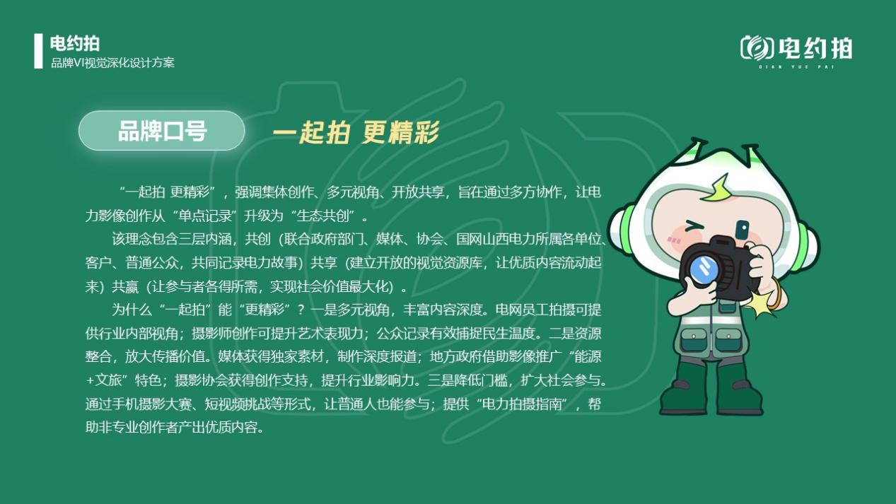 打造“電約拍”品牌,確定品牌定位、理念、愿景、口號、Logo、任務(wù),完成商標注冊,編制品牌手冊,制作文創(chuàng)產(chǎn)品,通過聯(lián)合采風(fēng)、展覽推廣品牌。借助IP人物“晉電小新”影響力,增強作品內(nèi)容吸引力與互動性,提升“電約拍”品牌知名度、認可度。