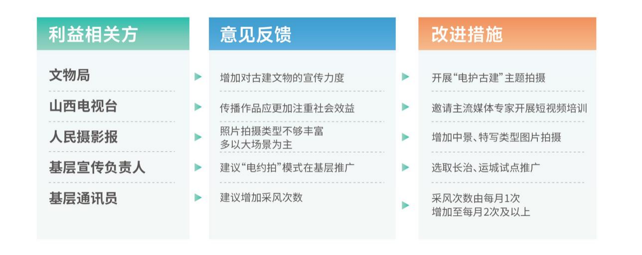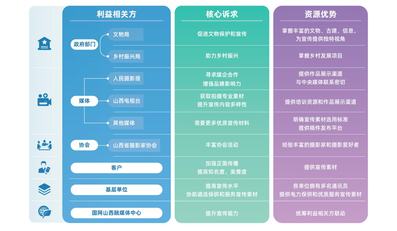 融媒體中心根植合作理念,將利益相關(guān)方拓展至政府部門(文物局、鄉(xiāng)村振興局等)、媒體(山西電視臺、人民攝影報等)、協(xié)會(山西省攝影家協(xié)會及市縣協(xié)會等)、基層單位、客戶(企業(yè)、人民群眾等),精準識別分析各利益相關(guān)方的核心訴求與資源優(yōu)勢,搭建多方溝通平臺,確保溝通協(xié)作順暢,推動形成優(yōu)勢互補、資源共享的合作格局。