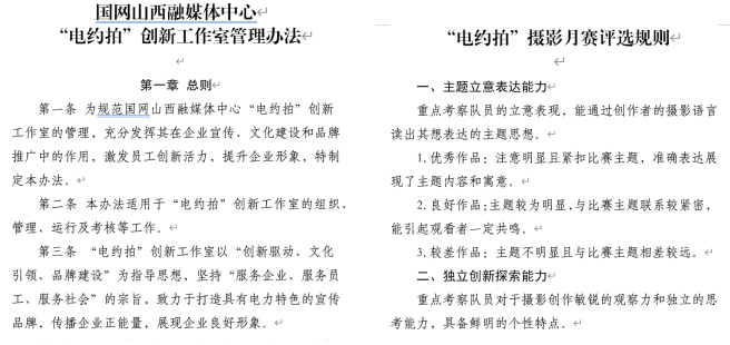 制定《“電約拍”創(chuàng)新工作室管理辦法》《2024年“師帶徒 青藍計劃”新聞采訪實訓(xùn)方案》《圖片資源管理系統(tǒng)管理辦法》《“電約拍”團隊積分獎勵辦法》《爭創(chuàng)“七個最”宣傳成果工作方案》《“為美好生活充電 為美麗中國賦能”攝影月賽評選規(guī)則》《“電約拍”采風(fēng)承諾書》等相關(guān)制度,通過完善的管理機制和制度,推進了項目規(guī)范化運營、標準化管理。加強團隊文化建設(shè),“電約拍——佳片有約”團隊師徒8人,通過附加“葫蘆家族”情愫,打造出“記錄時代、匠心傳承”的團隊文化。